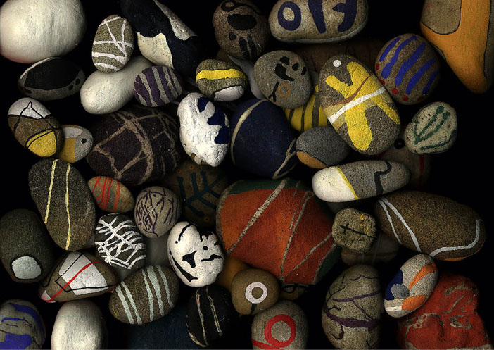 Die Entdeckung einer Serie bemalter Bachkiesel, deren Verwendung als Wortzeichen nicht einwandfei erwiesen ist, regte mich dazu an, eine Reihe unterschiedlicher Kiesel zu bemalen. Diese wurden wissenschaftlich katalogisiert und – mit Stammbaum und Entwicklungsschema versehen – in einem Buch vorgestellt. Dabei setzt sich die Sprache der Texte ironisch mit dem Duktus wissenschaftlicher Abhandlungen auseinander.