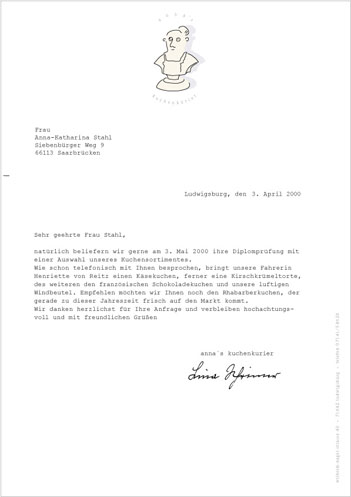Ausgehend von dem Zwang, zu jeder erdenklichen Zeit Kuchen backen zu müssen, entstand die Idee, diese Leidenschaft kommunikativ zu verarbeiten. Da eine Analyse des gegenwärtigen Marktes ergab, daß die guten, alten, selbstgebackenen Kuchen mehr und mehr durch Backmischungen oder tiefgefrorene Patisserie-Teilchen ersetzt werden, versucht anna´s kuchenkurier dieser Entwicklung entgegenzuwirken. Dieser Kuchenservice legt besonderen Wert auf die Herstellung ohne Haltbarmacher, Geschmacksverstärker und Zusätze; – es ist Selbstgebackenes wie von der Großmutter.